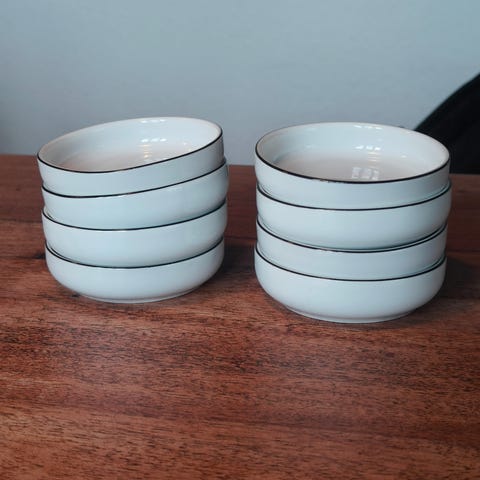 Porcelæn, Tallerkener, Små dybe tallerkener med motiv af hvede i brune farver på råhvid baggrund.