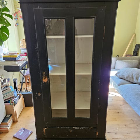 Flot vitrineskab med glas i siden og lågen samt en skuffe