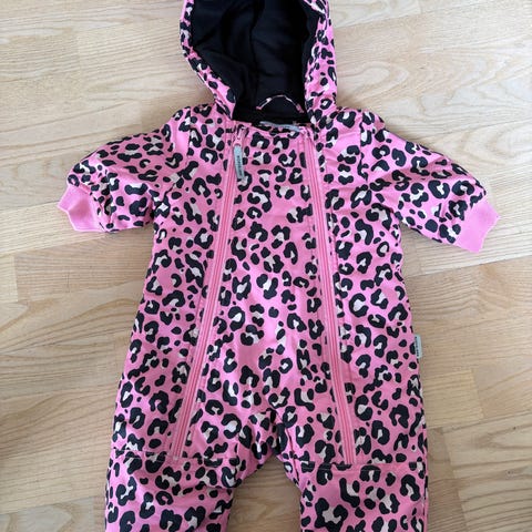 Flyverdragten er størrelse 74 mens, at overtræksskoene og vanterne er størrelse 80/86. Min pige passede det hele på samme tid, da hun brugte størrelse 74/80.