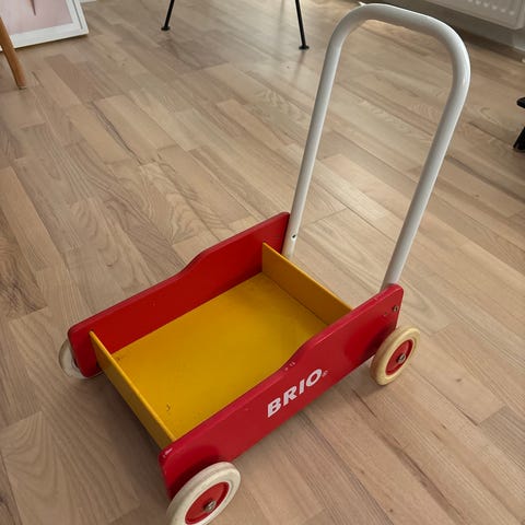 BRIO gåvogn i træ i rød og gul. Klassisk model med fire hjul og håndtag til at skubbe vognen. Velegnet som støtte til små børn, der øver sig i at gå, og til leg med at transportere legetøj eller andre småting. Vognen har åbent lad og faste hjul med gummiringe.