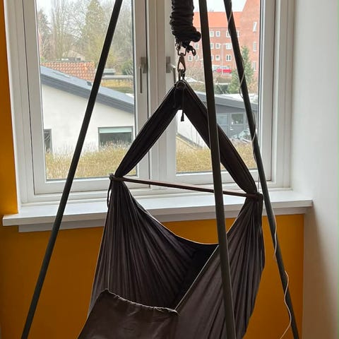 Gyngen kan bruges både bruges inden- og udendørs. Vi har kun brugt den indendørs, så fremstår som ny.