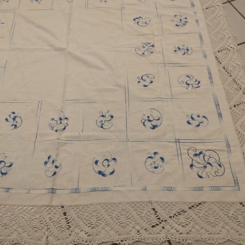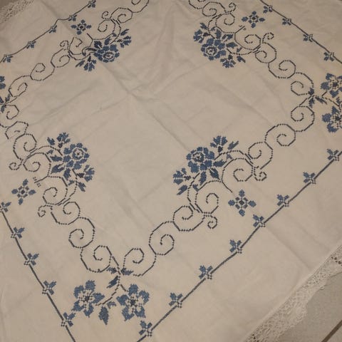 Dugen er I hvid lærred med blå/hvid blondekant og fint blå broderet mønster.