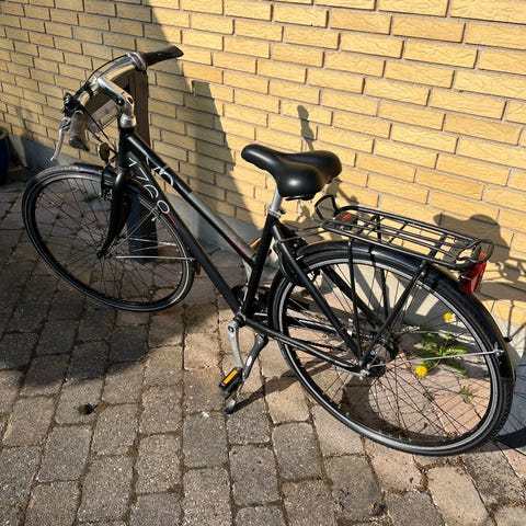 7 gear. Gode dæk, nyere kæde og tandhjul. Rullebremse og håndbremse på forhjul. Tromlebremse bag. Lås. Alt virker.