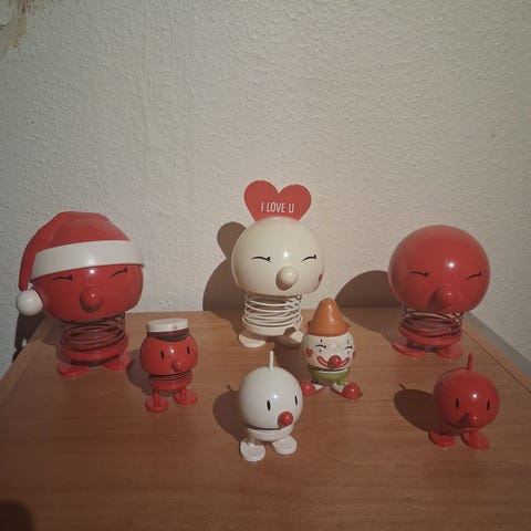 Hoptimist figurer sæt i plast i flere farver. Sættet består af fire klassiske Hoptimist figurer i gul, rød med kasket, grøn og hvid. Figurerne har fjedrende kroppe og står på små fødder. Velegnet som dekoration på skrivebord, hylde eller børneværelse. Kom med bud