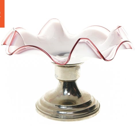 Visitkortskål, Ukendt, Visitkortskål i sølvplet. Er blevet nyforsølvet. Glasskålen måler 20 cm i bredden. Højden på skål med glasindsats er 20 cm. Glasskålen har et minimal lille mærke .Se foto. Er mindre end et knappenålshoved. Er fra røgfrit hjem og har kun stået til pynt i skab. .