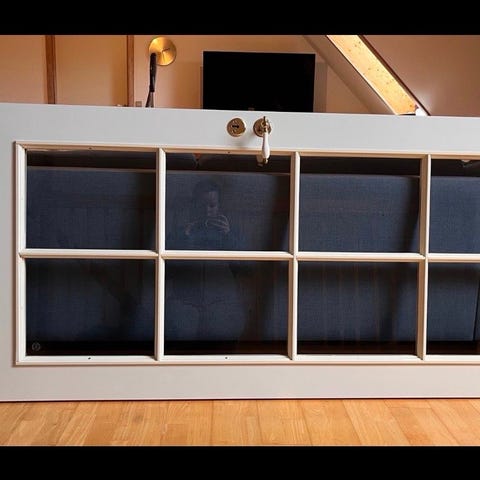 Indvendig dør i hvid farve med karm dog uden bundkarm. Døren har hængsler monteret i siden og greb/hul til låsekasse. Den ene side fremstår ensfarvet hvid, mens den anden side er beklædt med forskellige billeder i collage-stil. Velegnet som indvendig dør i bolig eller værksted, hvor der ønskes en enkel hvid flade på den ene side og en dekorativ overflade på den anden.
