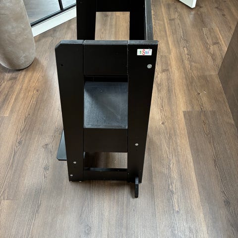 læringstårn i træ. Tårnet er udført i lyst træ med udskårne sider og flere trin, som giver barnet mulighed for at stå hævet ved f.eks. køkkenbord eller vask. Konstruktionen er åben med store udsparinger i siderne, så der er godt udsyn. Overfladen fremstår ubehandlet træ, som kan efterbehandles efter behov. Egnet til brug i hjemmet som hjælpemøbel til børn ved daglige aktiviteter.