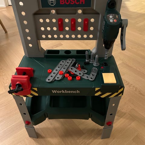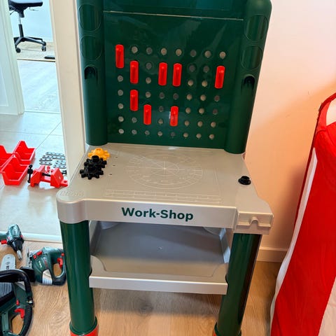 Fin værktøjsbænk inkl. alt som ses på billedet, herunder hjelm, to værktøjskasser med masser' værktøj + en elektrisk skruemaskine - alt virker.
