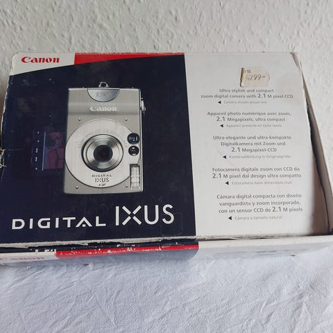 Canon IXUS digitalkamera i sort. Kompakt kamera med indbygget zoomobjektiv og stor skærm på bagsiden til visning og betjening. Velegnet til hverdagsfotografering og rejser, hvor et lille og let kamera er praktisk at have med. Leveres på billederne sammen med et etui.