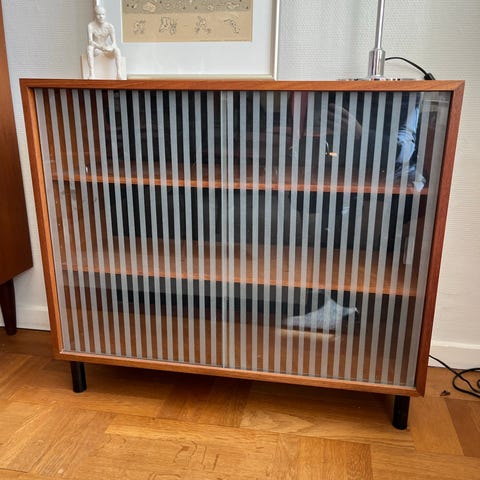 Flot vintage kommode i egetræ med skydelåge i glas og 2 skuffer. Møbler fremstår i god stand med aldersrelaterede brugsspor. Glaslågen kan afmonteres.
