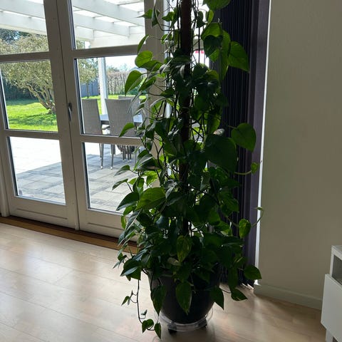 Palmen står i en hvid potte med sisal beklædt stolpe.