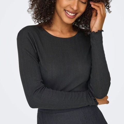 ONLY bluse til kvinder i størrelse XS. Langærmet model i beige med rund hals. Blusen har ribbet og let mønstret struktur samt bølgekant forneden og ved ærmerne. Velegnet til hverdagsbrug eller som lag på lag over en top eller under en jakke.