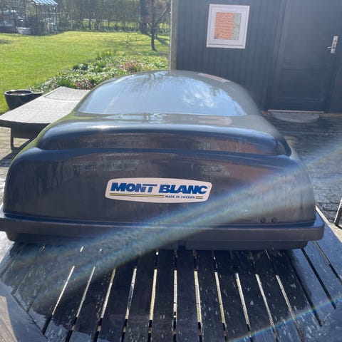 Mont Blanc tagboks/skiboks i fin stand. En virkelig rummelig boks der er super både til sommer- og skiferie. Den er lavet i glasfiber så den er robust, og der er gummitætning på låget så den holder tæt, også i kraftig regn. Der er de originale skiholdere og remme til den. Der er 2 nøgler til låsen. Der er lige monteret nye gasdæmpere, så den kan også holde låget oppe på skituren. Den kan monteres på de fleste typer tagbøjler.