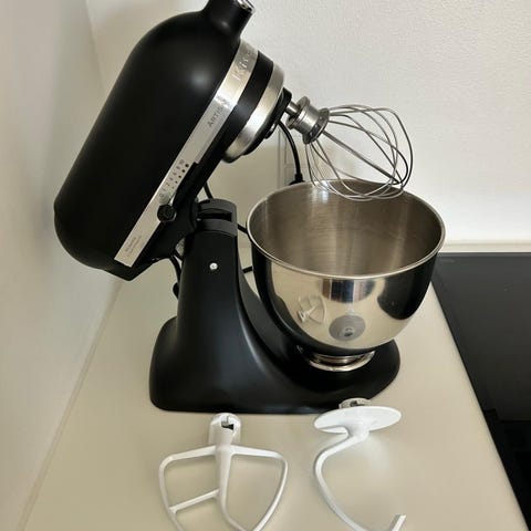 KitchenAid røremaskine i cremefarve med skål i rustfrit stål. Velegnet til æltning af dej, piskning og blanding af ingredienser i køkkenet. Maskinen står frit på bordet og tilsluttes med ledning til almindelig stikkontakt. Egnet til daglig madlavning og bagning i hjemmet.