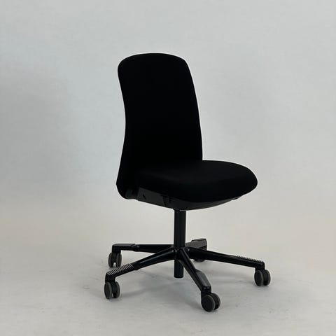 - Sæde og Ryglæn: Stolen er betrukket med sort, slidstærkt tekstil, der giver et elegant og tidløst look. Det ergonomiske ryglæn sikrer støtte til hele ryggen og bidrager til en behagelig siddestilling, selv under lange arbejdsdage.