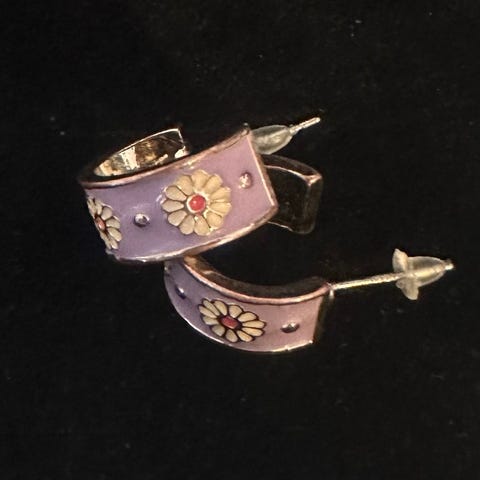 Runde ørestikkere med glitrende design i rødlige farver, de har lidt patina på bagsiden ved ikke om det forsvinder ved en rens