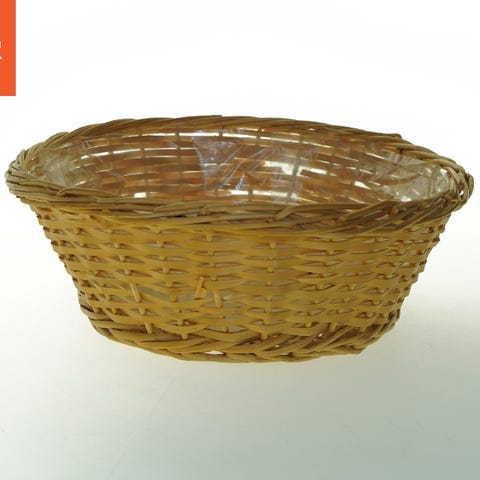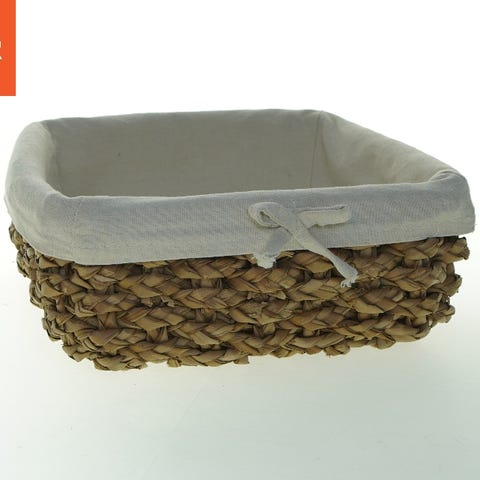 Denne kurv er lavet af flettet materiale med en buet topside med håndtag. Indersiden er foret med et stoffet lag, som har blåt blomsterdesign. Kurvens størrelse er 33 cm. Den er ideel til opbevaring eller som en dekorativ genstand i hjemmet. Tags: kurv, opbevaring, dekoration, flettet.
