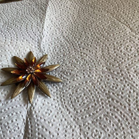 Brochen er dekoreret med flere farvede sten og har en gylden base. Den måler 3,5 cm i længden. På bagsiden ses en nål, der gør det nemt at fastgøre brochen til beklædningsgenstande.