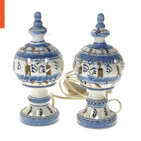 Bordlampe med keramisk base dekoreret med asiatiske figurer og landskaber. Lampen er 42 cm høj og 11 cm i diameter. Den har en hvid elektrisk ledning og messingfarvet top ved pæren. Designet er farverigt, med dominans af grønne nuancer og guld detaljer.