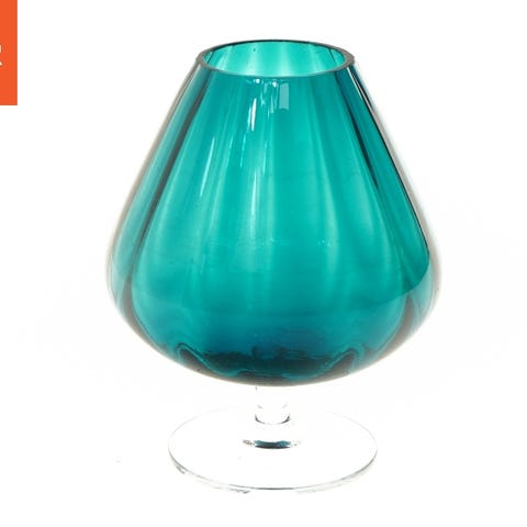 Denne vare er en blå vase lavet af glas. Vasen har en unik form med ribbet detaljearbejde på både den øvre og nederste del. Den er 24 cm høj og 16 cm bred, og den bærer et logo, der kan indikere en mærkevare. Vasen er velegnet til dekorationsformål og kan bruges til at holde blomster eller blot som en stilfuld indretningsgenstand. Tags: glas, dekoration, vase, blå