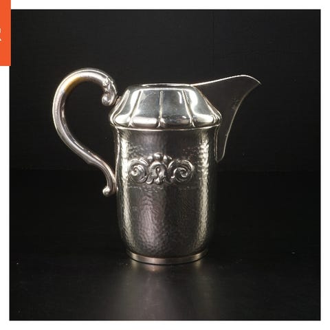 En vintage sølv mælkekande med en dekorativ håndtag og tre ben. Kanden har en klassisk design med en tud til hældning. Den måler 13x8 cm og har en antik finish.