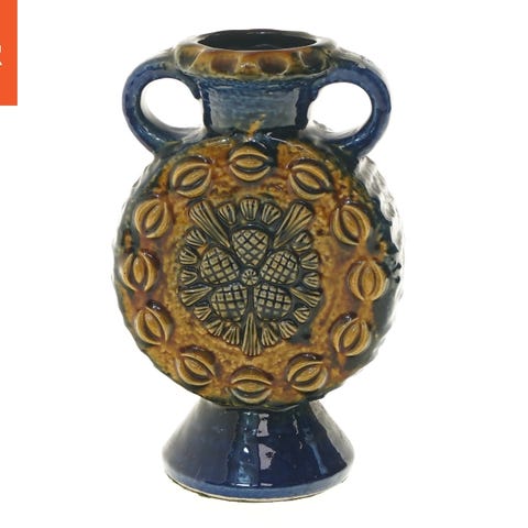 Denne vase er udsmykket med farverige mønstre og har to integrerede håndtag. Den er lavet af keramik og har en størrelse på 15x11 cm. Vasen har et klassisk design med detaljer som blomster og buede linjer. Den er velegnet som dekoration i hjemmet.