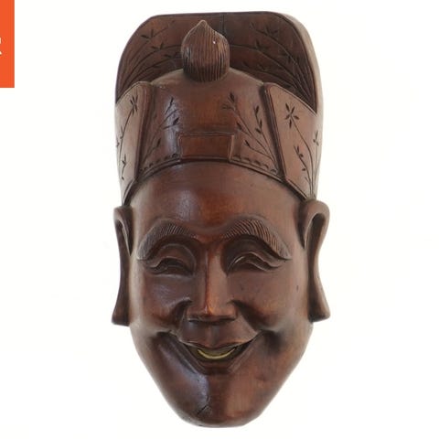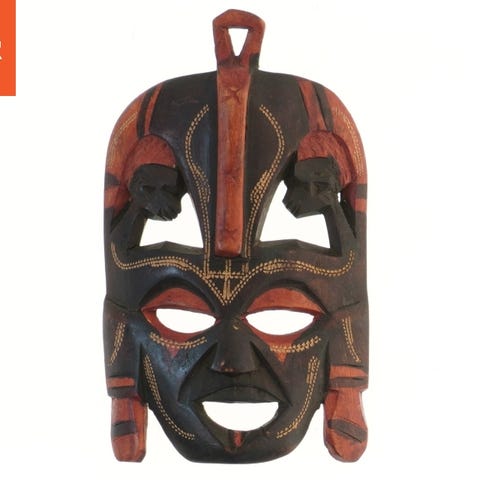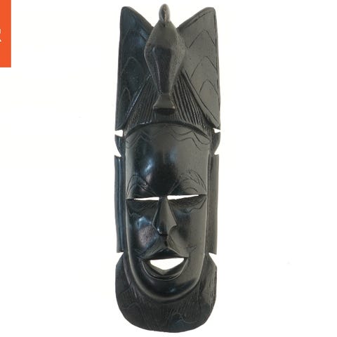 Træmaske med udskårne detaljer. Masken er generelt mørkebrun med tekstureret overflade og har øjen-, næse- og mundudskæringer. Den kan hænges op med den røde snor i toppen.