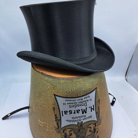 Antikt cylindertophat fra den tidlige fase af det 20. århundrede (ca. 1910–1920), lavet af sort silkesvelour.