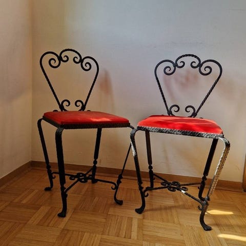 To messingstole med rødt velourbetræk i Hollywood Regency vintage-stil, højt ryglæn, mål 112 cm i højden, 37 cm i bredden og 38 cm i dybden, sædehøjde 49 cm, fremstillet i Lombardiet, Italien, i god stand med mindre aldersrelaterede mærker; afhentning i Brescia by. Klik på den blå "gå til varen" knap, for at købe eller byde på denne vare. Den samlede pris vil blive vist inden du afgiver dit bud.