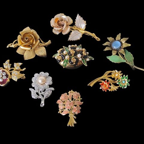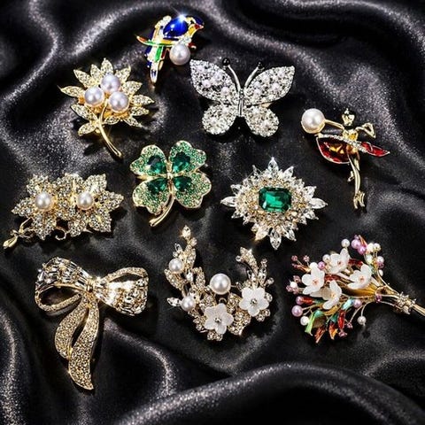 Denne guldfarvede forgyldte malteserkors-brosje er indlagt med efterlignede smaragdkristaller og klare, gnistrende krystaller, fremhævet med efterlignede perler i enderne.
