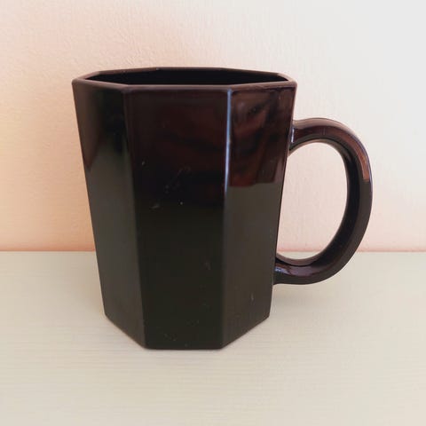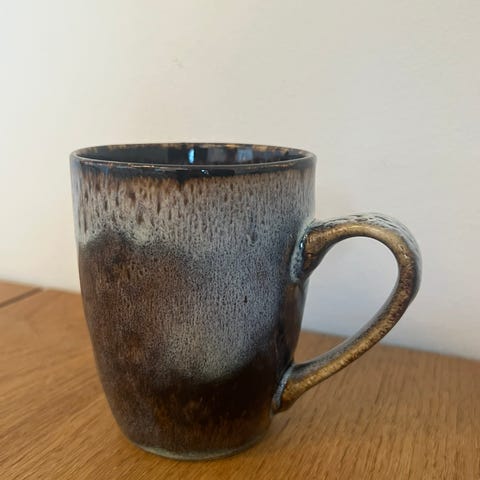 Krus i keramik med sort yderside og inderside samt lys, rå bund. Kruset har hank og er egnet til varme drikke som kaffe, te eller kakao. Størrelsen fremgår af billedet med lineal. Velegnet til daglig brug i køkkenet.