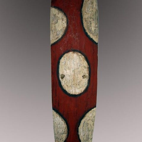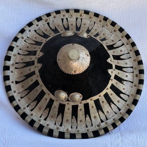 Disse meget tykke læderskjolde - beregnet til jagt og krig - blev fremstillet af specialiserede håndværkere. Disse spændte et stykke skind ud med pinde på en buet træform, hvori sten var indlagt i stråler og buler: reliefet, der opstod, er oprindelsen til betegnelsen "i skildpaddeskjold", som disse skjolde antyder. Når det var tørret i solen, blev skjoldet garvet og oliebehandlet. Når det tørrede, dannede kanterne en smuk kant. Håndværkerne foretog derefter meget fine parallelle snit, synlige på de nærbilleder. Nogle gange, som på dette eksemplar, afsluttede bånd af rødt oker dekorationen.