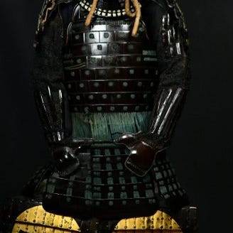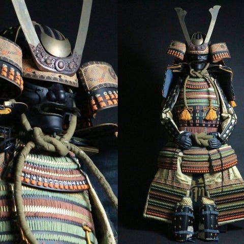 Ægte samurai-rustning fra midt-Edo-perioden fra Japan med Kabuto og Menpo, certificeret Tokubetsu Kicho af Japanese Armor Society, ca. 156 cm høj og 42 cm bred, i rimelig stand med tegn på ældning. Klik på den blå "gå til varen" knap, for at købe eller byde på denne vare. Den samlede pris vil blive vist inden du afgiver dit bud.
