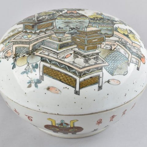 En rektangulær teæske i lakeret træ fra Kina, fra Qing-dynastiet, med titel “Rectangular Tea Box - Dozens of People, Pavilions and Pagodas in Chinese Landscape”, måler 29,8 cm i bredde og 14,8 cm i dybde, med firkantede messinghængsler og en solid lås, i god stand med mindre aldersmærker. Klik på den blå "gå til varen" knap, for at købe eller byde på denne vare. Den samlede pris vil blive vist inden du afgiver dit bud.