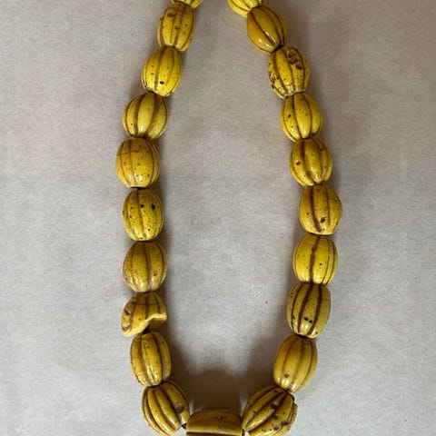 Et solidt sølvhalsstykke: et hængslet choker med to fiskemåneformede endestykker, fra hvis der hænger to glas lapis-farvede perler og to retikulerede Fatima-hænder, i alt en højde på omkring 24 cm og en samlet vægt på 255 g. Et dejligt stykke etnisk smykker, sandsynligvis fra 19. århundrede.