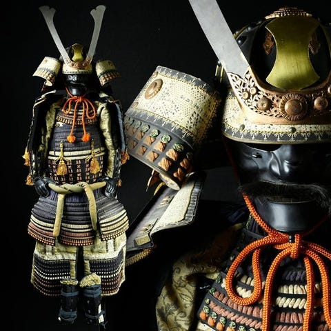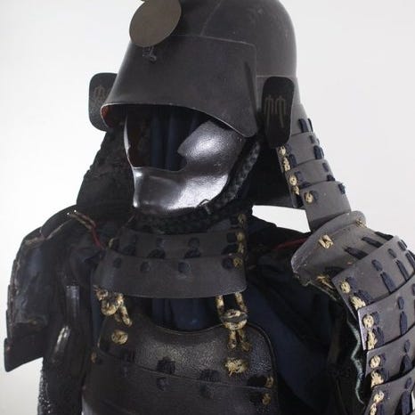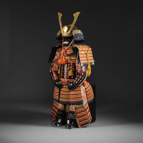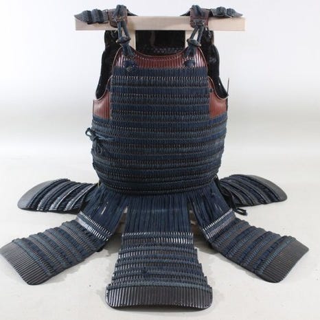 Japansk Yoroi- rustning i sort lakeret med kobber og forgyldt efeu-, 8-pladet Kabuto-helm og matchende cuirass, inklusive boks og træstativ; mål ca. H 160 cm × B 50 cm × D 60 cm; dateret til 1970'erne–1980'erne; generelt acceptabel stand med afskalning af lak, rust, rifter og tråde som beskrevet. Klik på den blå "gå til varen" knap, for at købe eller byde på denne vare. Den samlede pris vil blive vist inden du afgiver dit bud.