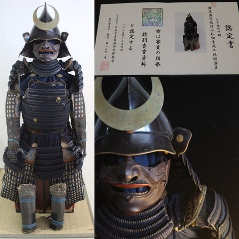 En fuldkomment sammenpasset japansk sort lakering rustningsdragt (Yoroi) med faste snore, lilla/hvid kant og en 2-delt cuirass (kuro’urushinuri kon’ito hi’suso nimaidô tôsei gusoku) med guld familiecrests: ivy 蔦 (Tsuta).