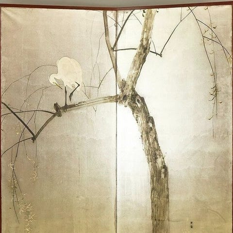 En enestående, høj seks-panelers byôbu 屏風 (foldesklæde) med en raffineret Kanô-skolestil maleri, der skildrer et fredeligt landskab med en samling trækroner 鶴 (tsuru).