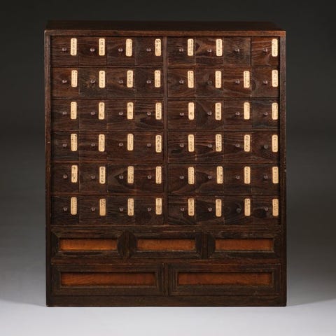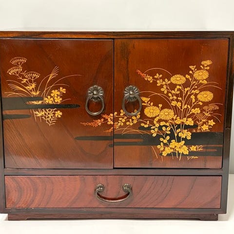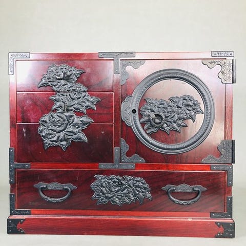 Skuffefrontene er fremstillet af kvalitets solid keyaki 欅 (zelkova) træ, mens rammen er konstrueret af oprindelig sugi 杉 (ceder). Skabet er færdigt i en mørkerød Shunkei-style 春慶 lak, der blidt afslører den naturlige træåre under.