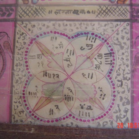 Et tantrisk manuskript med tal og bogstaver på sanskrit anvendt på menneskefiguren udgør en del af en bog. Teksten, der ledsager det, er svær at forstå og svær at læse for en person, der ikke er begyndt på studier af denne type.