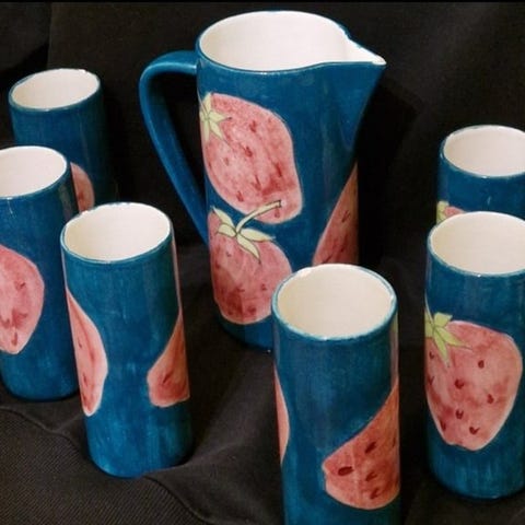 Italiensk keramik, komplet service til bordet fra 1960’erne inspireret af oldt grekisk stil, signeret af fabrikken Tofanacchio, håndmalet med fine detaljer, inklusive en kande, et stort glas, seks glas og seks små glas, mål: 30 cm høj, 15 cm bred, 10 cm dyb, i god brugt stand med mindre aldersmærker og pletter. Klik på den blå "gå til varen" knap, for at købe eller byde på denne vare. Den samlede pris vil blive vist inden du afgiver dit bud.