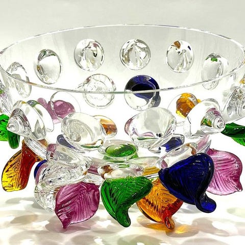 Smuk skål i Murano-stil, delvist fremstillet af uranglas og mangananglas. Den giver lys under UV-395 (foto med lilla lys) og UV-365 lys (foto hvor vaseen lyser kraftigt), hvilket bekræfter brugen af uran og mangan. Uran og mangan blev ikke kun brugt i Murano-glas, men også glasproducenter som Val Saint Lambert, Doyen og Scailmont gjorde brug af dem. Urankoncentrationen er dog lav, men den er stadig synlig (se billeder med lilla lys). Skålen er i særdeles god stand med minimale chips i bunden, som ses på billederne.