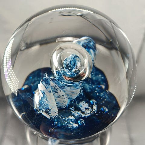 Ekseptionel kunstglas-påpapirholder, designet og fremstillet i 1991 af Selkirk Glass i Skotland, kaldet „Concerto“, ægformet med et spiralformet væv af hvide og lyserøde glasfibre over en rød marmorbaser, centralt omgivet af et blå-hvidt marmoreret objekt; bundsigneret: „Selkirk Glass Scotland – Concerto 1991“; målene 8,9 x 7,6 x 7,6 cm, vægt 702 g, i fremragende stand med minimale aldersmærker. Klik på den blå "gå til varen" knap, for at købe eller byde på denne vare. Den samlede pris vil blive vist inden du afgiver dit bud.