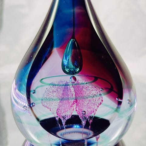 Ægformet. Over en rød marmoreret bund rejser sig en spiralformet struktur lavet af tynde hvide og lyserøde glasfibre. Den omfavner en centralt blå-hvid marmoreret genstand. Vidunderlige farveleg og smukke optiske