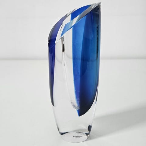 Salviati Sirena oval i Murano-glas, blå aquamarin og safir, 18 cm bred, 27 cm høj, 8 cm dyb, ca. 4 kg, Italien, 1970–1980, i næsten som ny stand. Klik på den blå "gå til varen" knap, for at købe eller byde på denne vare. Den samlede pris vil blive vist inden du afgiver dit bud.
