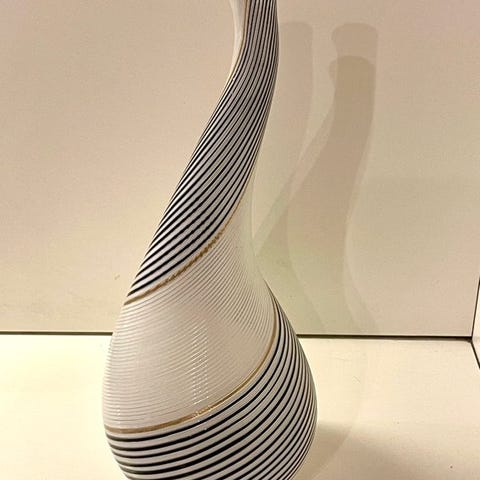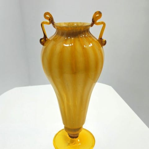 Monumental Murano-glasvase, årtierne 1920/1930. Stråfarvet, blæst glas dekoreret med mælkede pletter. Håndtag i krølleform påsat ved varme, vase i svungen form med dobbelt hals, dekoreret med striber. Et virkelig pragtfuldt stykke til ethvert miljø.