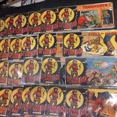 Hondo, Zenit-serie II, anden original udgave i stribeformat, udgivet af Audace i 1956, 17 numre af Gian Luigi Bonelli (manuskript) og F. Bignotti (tegning), i fremragende stand og mangler nr. 16. Klik på den blå "gå til varen" knap, for at købe eller byde på denne vare. Den samlede pris vil blive vist inden du afgiver dit bud.
