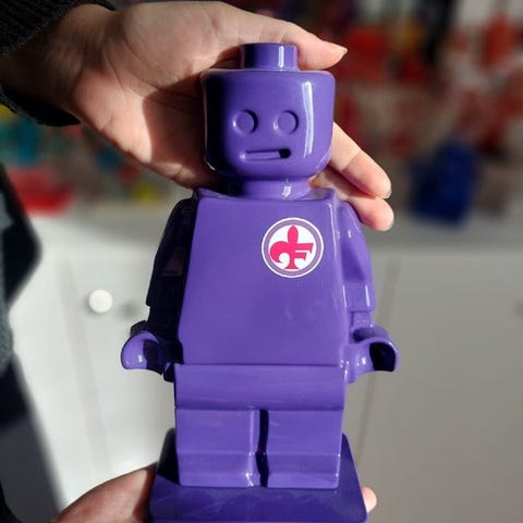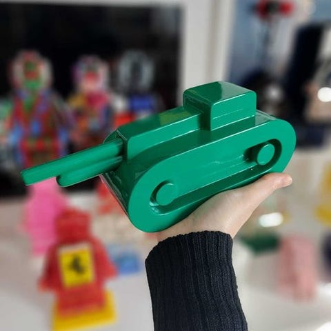 De nye skulpturer er i farvet resin og forestiller barndommens legetøj.