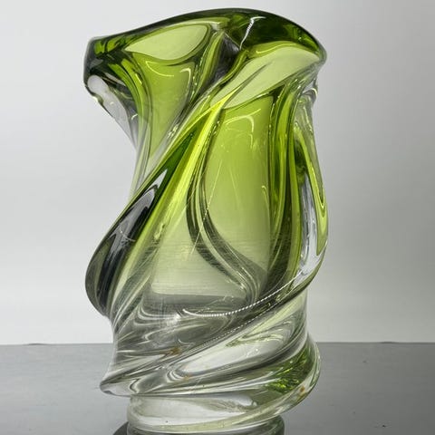Massiv krystalvasen signeret Val Saint-Lambert – moderne fantasiestykke, model Mulette chartreuse grøn, 2,15 kg
