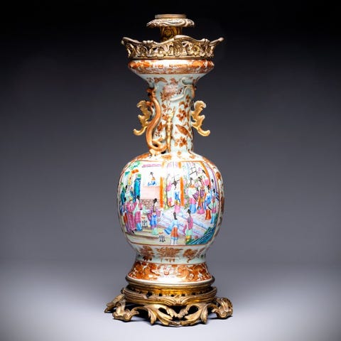 Grene i balusterform, fire fuldt reliefforgyldte drager der jager den jernrøde hellige perle anbragt ved skulderen, mund/øverste kant støbt i spiralribber. Fint malet og rigt forgyldt, kroppen med vekslende paneler af mandarinske indre scener og blomster, eksotiske fugle, frugter og insekter grupper, adskilt af